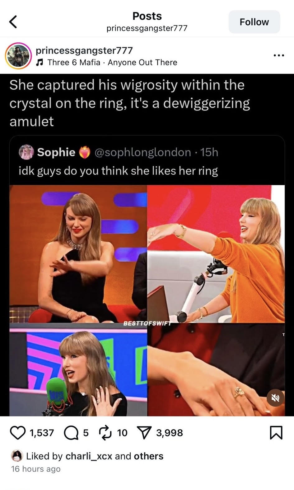 The meaning behind the post is being speculated about online and what Charli XCX liking about it says about the pair’s relationship. The meme is responding to Taylor Swift showing off her engagement ring from Travis Kelce, and appears to be a comment on discourse surrounding Travis and his dating history.