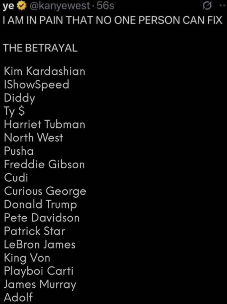 Back in September, Kanye went on one of his weird viral Twitter rants and posted a wild list shaming people who have supposedly betrayed him in his life. Well, he claims they have anyway.