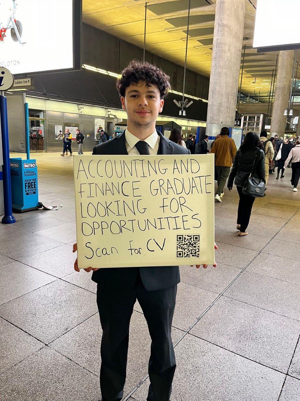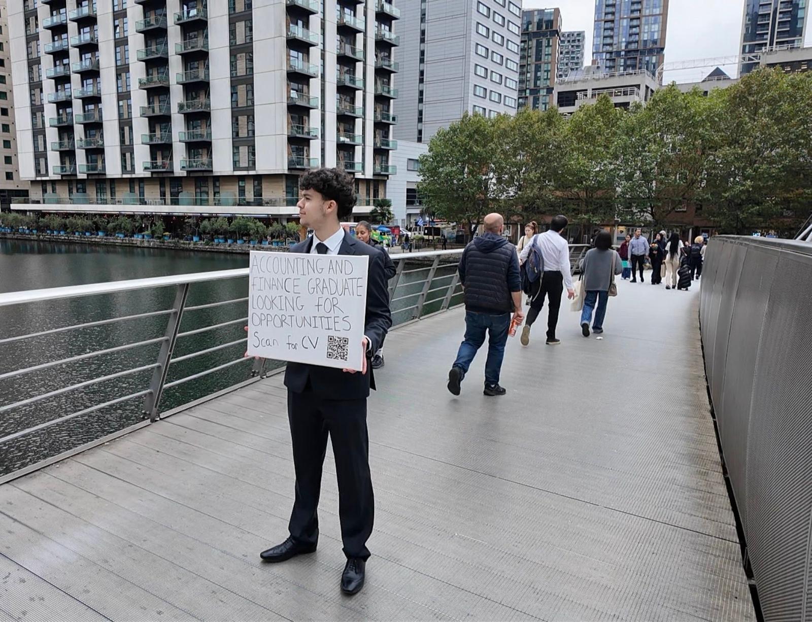A London graduate went viral after taking his job search quite literally to the streets, standing in Canary Wharf for eight hours with a sign displaying a QR code linked to his CV.