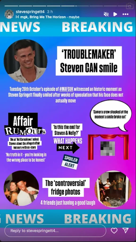 The groom shared a post reacting to the partner swap episode and turned each moment into a news headline. One of them said “Affair Rumours” and he wrote underneath: “We at ‘No1CaresNews’ asked Steven about the alleged affair rumours with co-stars.”