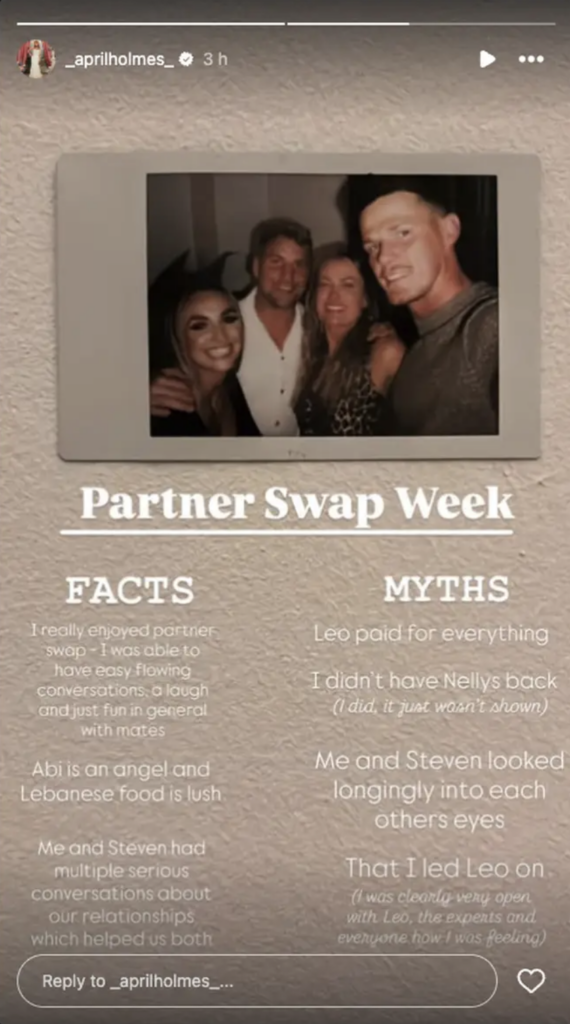 April addressed the rumours in a similarly jokey way, posting a series of “facts” and “myths” about the partner swap week. In the “myths” column, she wrote: “Me and Steven looked longingly into each other’s eyes.”