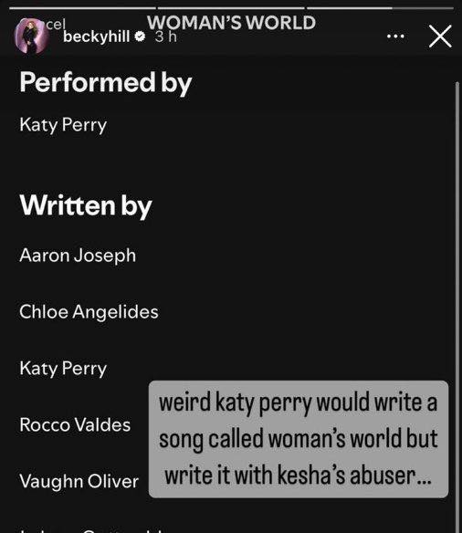 Becky Hill posted the credits to Woman’s World on her Instagram story saying “weird Katy Perry would write a song called Woman’s World but write it with Kesha’s abuser…” This was referring to the allegations Kesha made against Dr Luke.