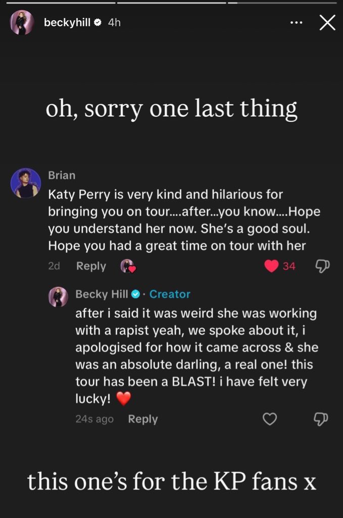 Becky Hill then replied saying “After I said it was weird she was working with a rapist [Dr Luke denies all allegation] yeah, we spoke about it, I apologised for how it came across and she was an absolute darling, a real one! This tour has been a blast. I have felt very lucky.”