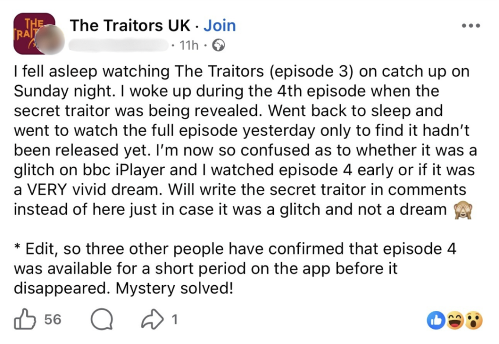 “I’m now so confused as to whether it was a glitch on BBC iPlayer and I watched episode four early or if it was a VERY vivid dream. Will write the Secret Traitor in comments instead of here, just in case it was a glitch and not a dream.”