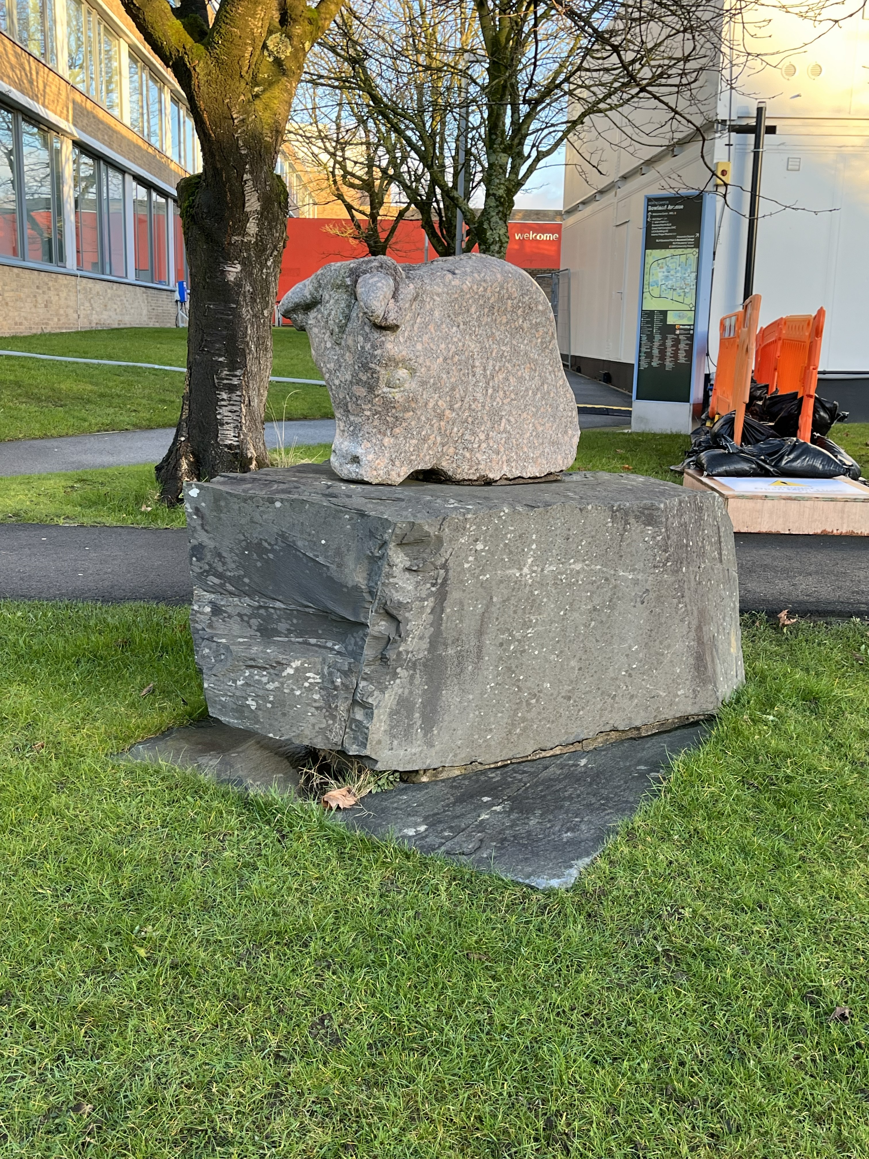 Alongside the famous artwork on campus, there is a sculpture by Shawn Williamson (1991) called Bull’s Head, which is (you guessed it!) a bull’s head made out of Shap Granite. This is a hidden treasure as it is not visible within the centre and spines of campus. It is located outside of the Chaplaincy centre and adds a unique visual to the area.