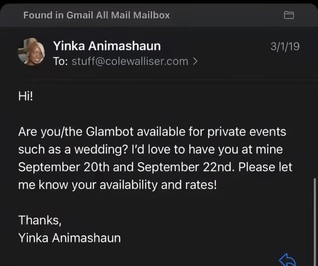 Yinka shared an alleged email conversation between her and Cole online, where she asked to hire a Glambot for the wedding, and it’s gone viral because of his response. The Glambot guy appeared to rudely question her ability to pay for the pricey piece of tech.