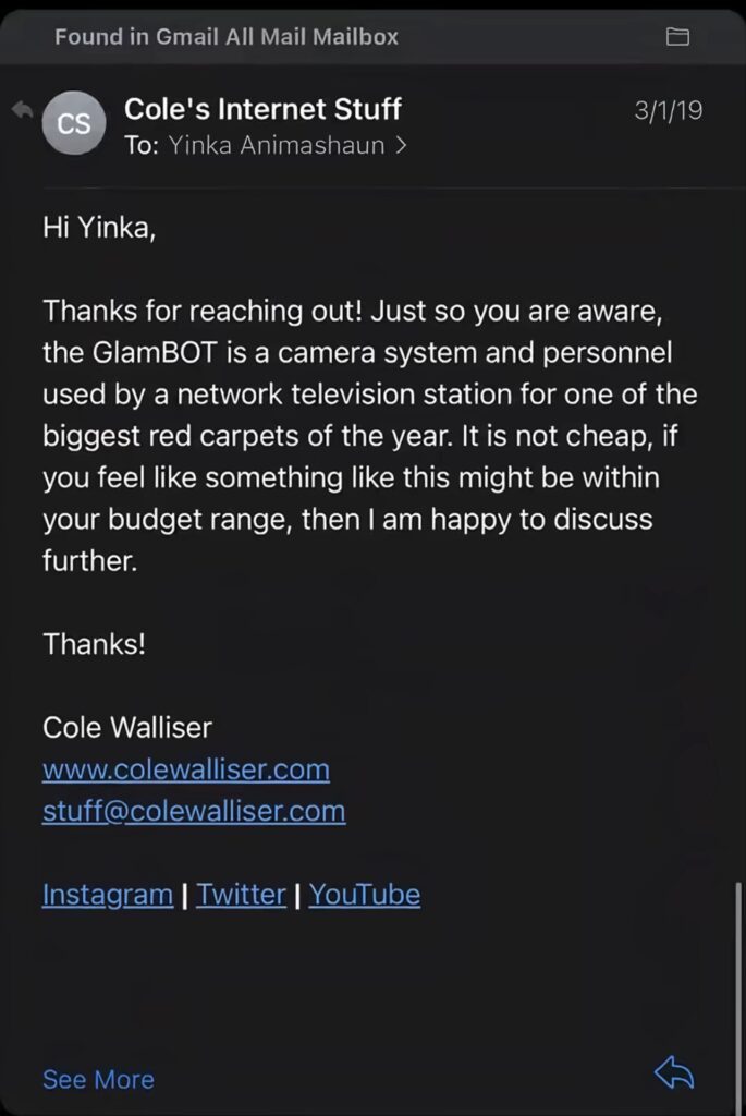 “Thanks for reaching out! Just so you are aware, the GlamBOT is a camera system and personnel used by a network television station for one of the year’s biggest red carpets. It is not cheap. If you feel like something like this might be within your budget range, then I am happy to discuss further,” he allegedly wrote.