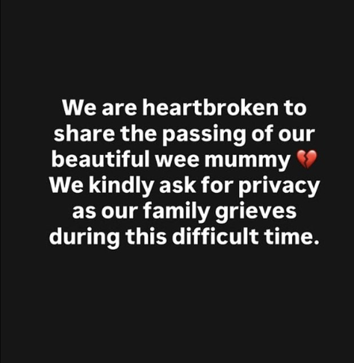 On Tuesday, Rachel shared the devastating news on Instagram, writing: “We are heartbroken to share the passing of our beautiful wee mummy. We kindly ask for privacy as our family grieves during this difficult time.”