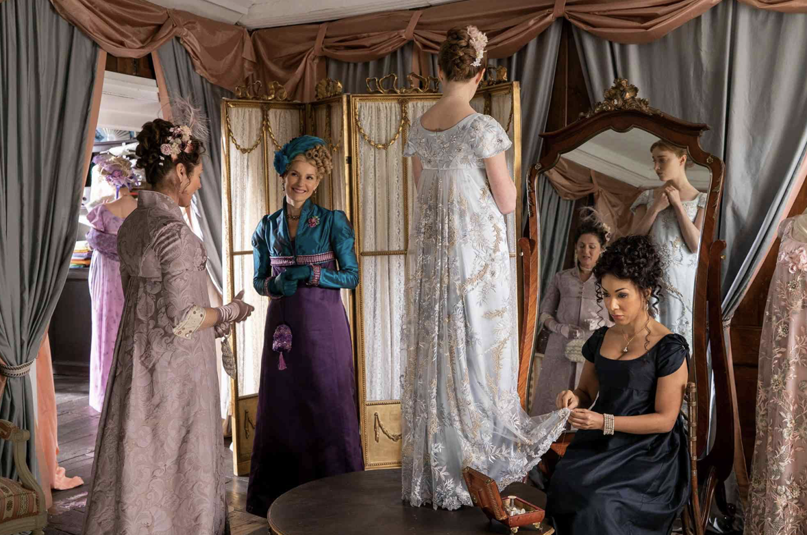 Dialogue in recent episodes of series four has hinted at a modiste relocating to new premises: During a conversation with the Hollis mother and daughter, Violet Bridgerton remarks, “she made wonderful dresses but now has new premises.” Although no name is mentioned, it seems likely that she is referring to the modiste.