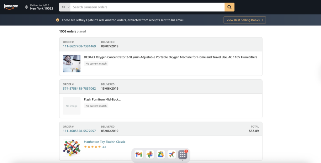 Now, the same person has had created “JAmazon” which lets you look through the real items Epstein ordered on Amazon, and see the exact date and time he ordered each one.