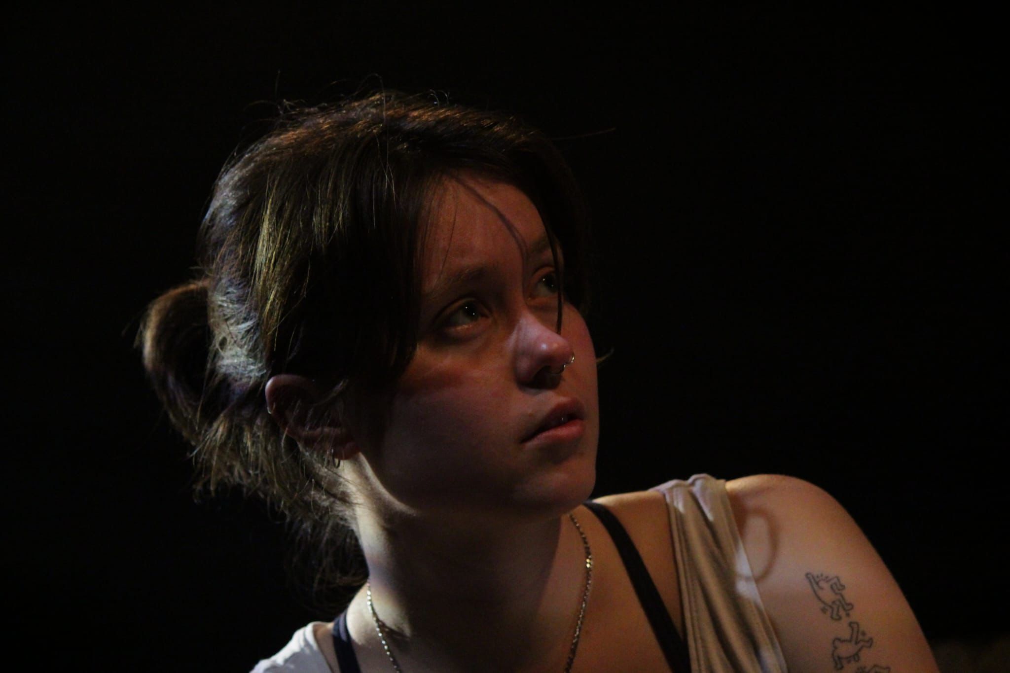 Darling and Beautiful are wrapped up in a web of lies, some to eachother and some to themselves. Darling seems happy to let them be, whilst Beautiful undertakes their unrevelling. This push and pull through sex and dialogue climaxes in a disagreement as to what their bodies mean to them. “This body is political”. Beautiful declares taking off their shirt, not triumphantly, but with resignation. They feel an obligation to care and, in their strength to speak out is their vulnerability.