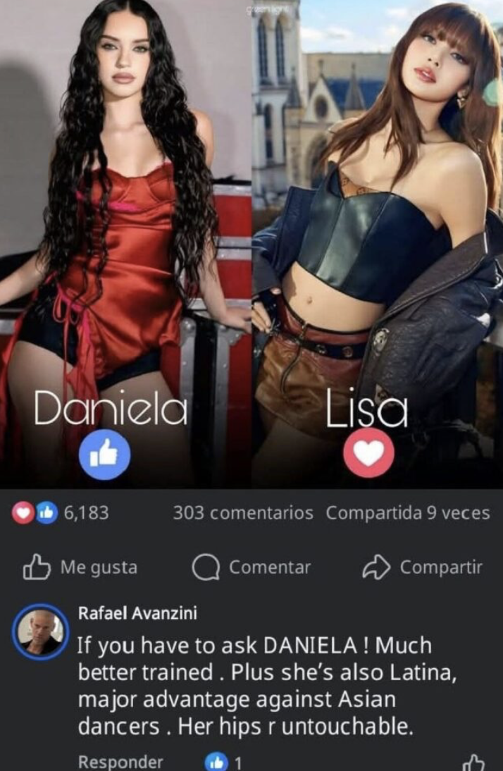 In a Facebook post from a fan page asking who people preferred as a dancer, Daniela or Lisa of BLACKPINK, an account matching Rafael Avanzini’s name and previously linked Instagram wrote: “If you have to ask DANIELA! Much better trained. Plus she’s also Latina, major advantage against Asian dancers. Her hips r untouchable.”
