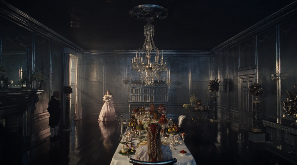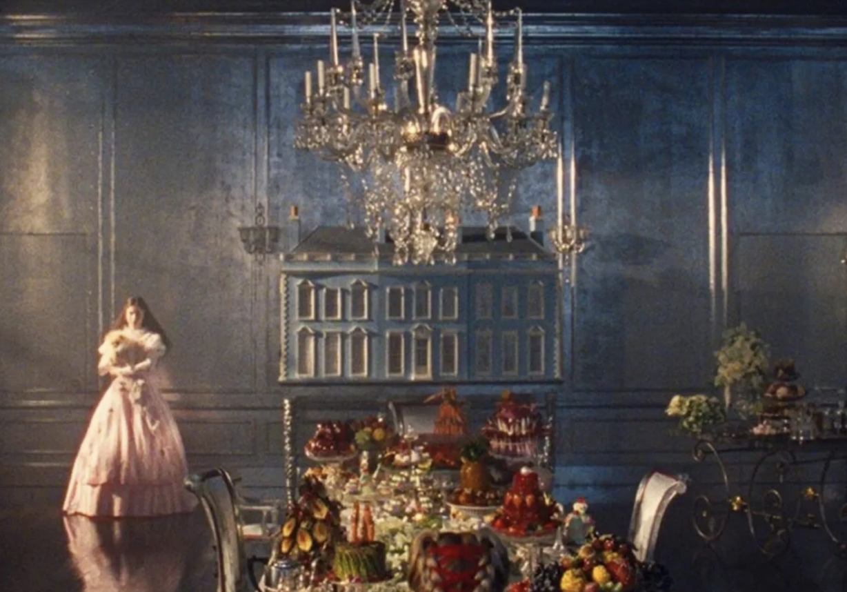 Thrushcross Grange’s uncanny vibe starts with its scale. The house was designed to feel like an expanded dollhouse, making the characters seem slightly diminished in their surroundings, a subconscious cue that something is off. Even its striking blue exterior was chosen to feel out of place against the windswept moors, visually signalling that the Grange doesn’t belong.