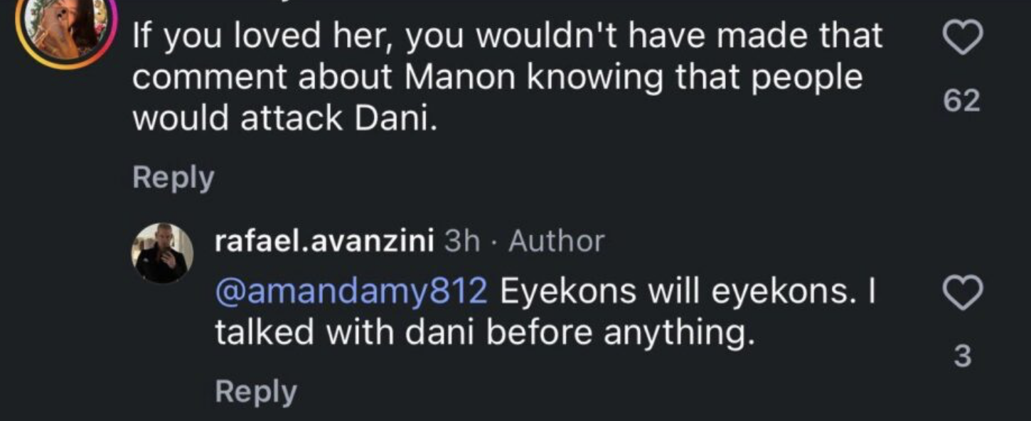 The backlash intensified when Rafael reportedly replied to multiple fans attempting to clarify his comments. In one exchange, he claimed Daniela had spoken with him before he made the earlier remarks about Manon, a statement that immediately sparked outrage and dragged Daniela herself into the controversy.
