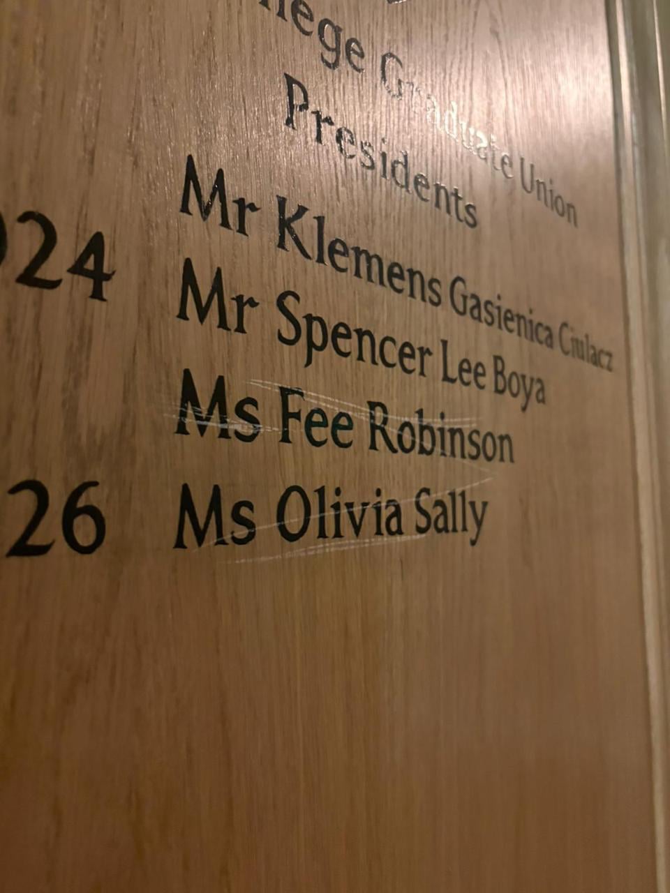 The names of all the female presidents at a Cambridge University college society have been scratched out following the start of Women’s History Month.