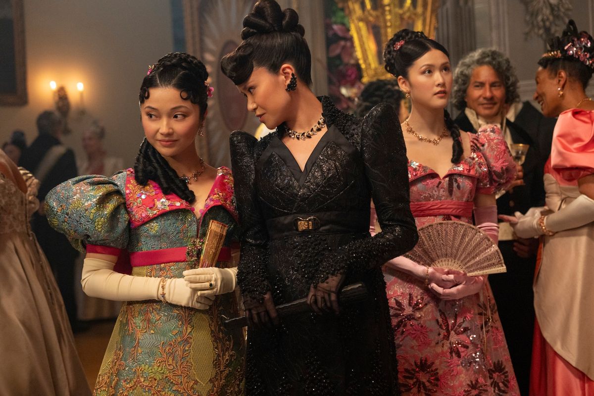 The gowns first appear earlier in the season, and then the sisters show up wearing those same outfits again at the Queen’s ball in episode eight. In a show where characters usually have brand-new gowns for every big event, that detail definitely stands out.