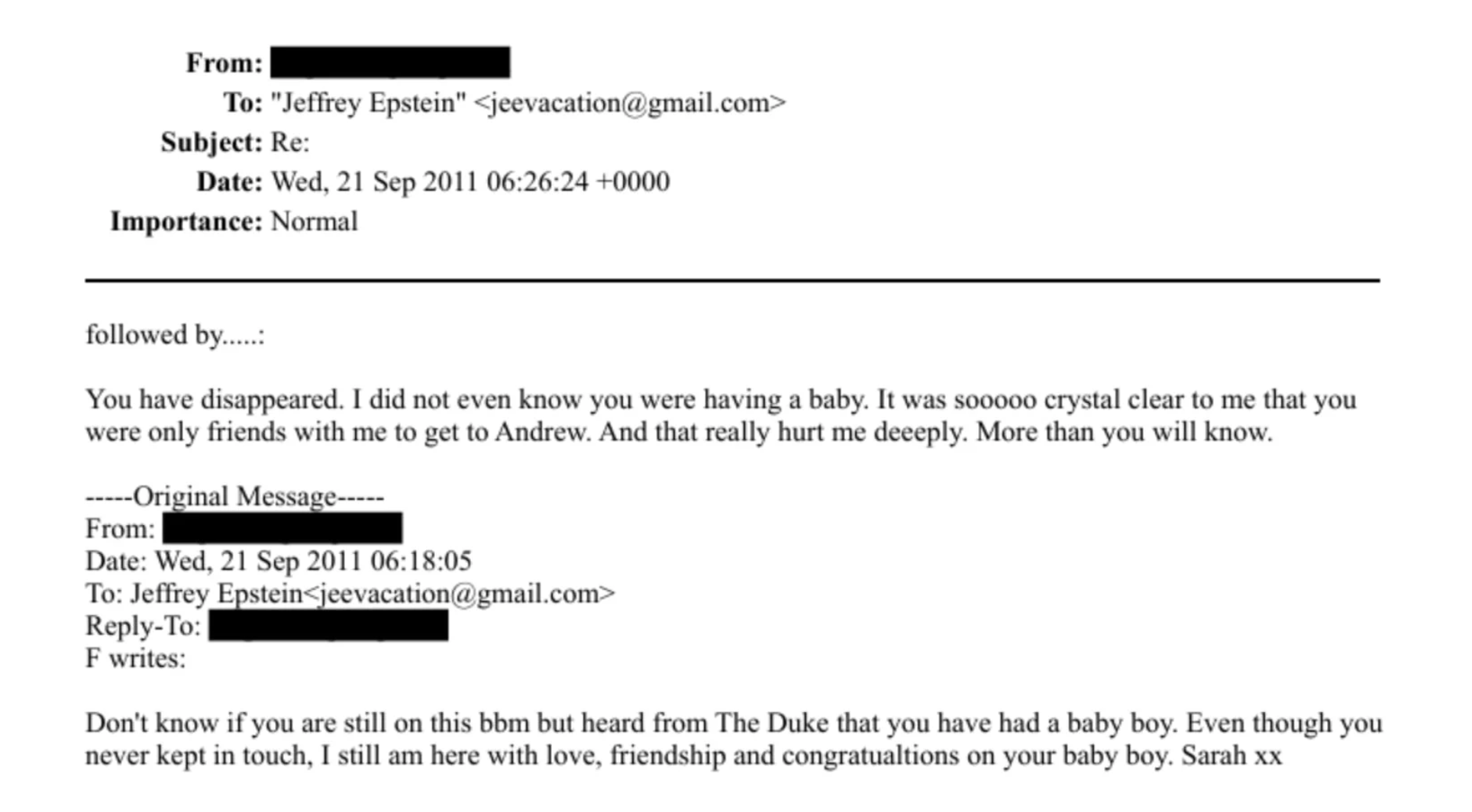 In a message dated September 2011, Ferguson appeared to congratulate Epstein on the birth of a child.