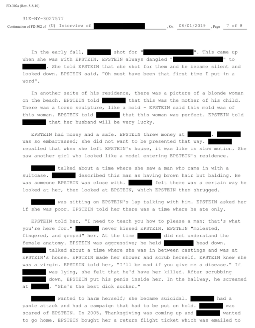 Another reference to a possible child emerged in a 2019 FBI interview with a woman who said she met Epstein at the age of 16 while working as a model in New York. The account appears in an FBI 302 report that was later released as part of the Justice Department’s Epstein files.