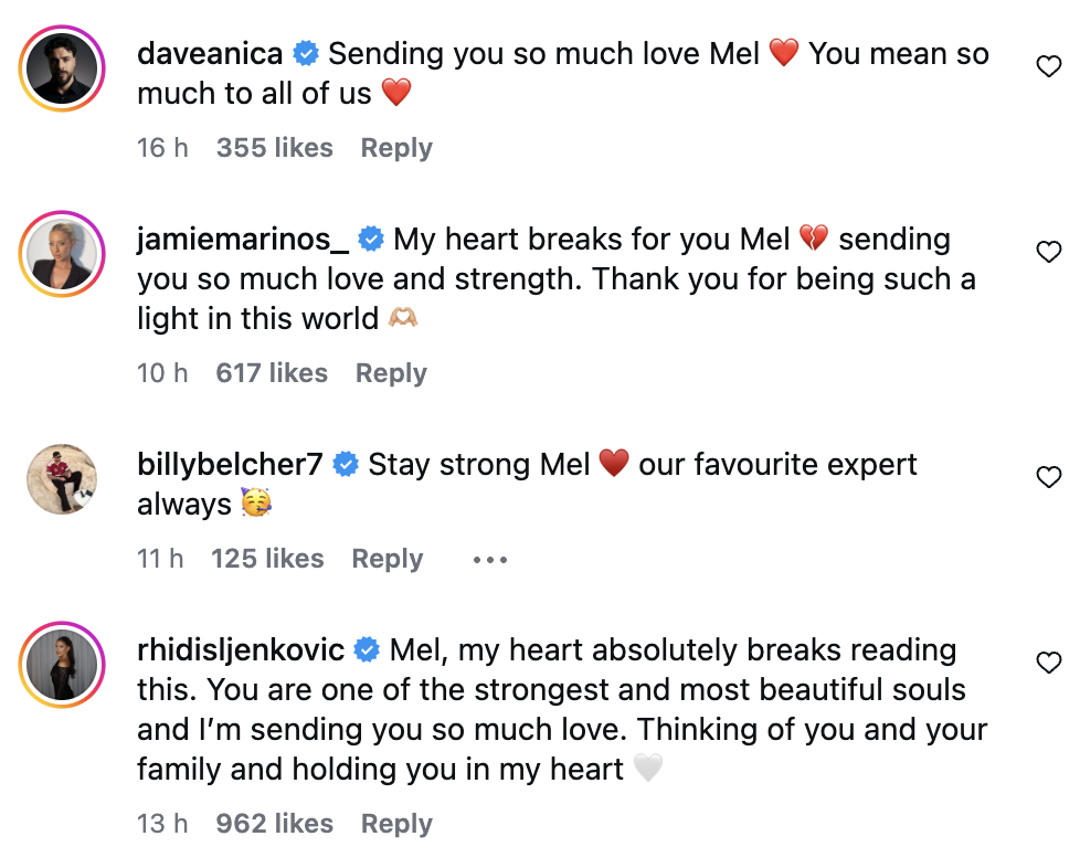 Also in the comments was sexpert Alessandra Rampolla, who wrote: “My Mel, beautiful chica. My heart breaks reading this, but I am endlessly grateful for every moment we’ve shared. You are SO deeply loved, my friend!! Holding you and your beautiful family close to my heart. Always.”