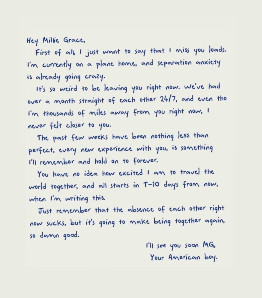 “You have no idea how excited I am to travel the world together, and all starts in T-10 days from now, when I’m writing this. Just remember that the absence of each other right now sucks, but it’s going to make being together again so damn good.”