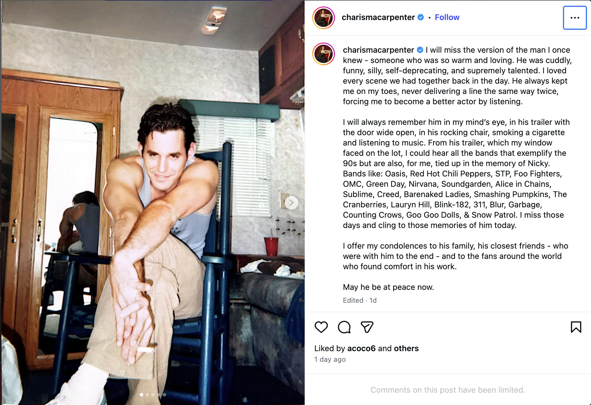 In a lengthy Instagram post, Cordelia’s actress, Charisma Carpenter, mourned the loss of her friend.