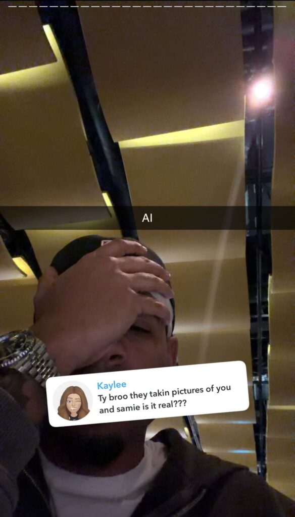 Someone asked Tyrique about the viral video on Snapchat, saying: “Ty broo they takin pictures of you and Samie is it real?” He responded with a photo of himself with his hand over his face in despair alongside one word: “AI.”
