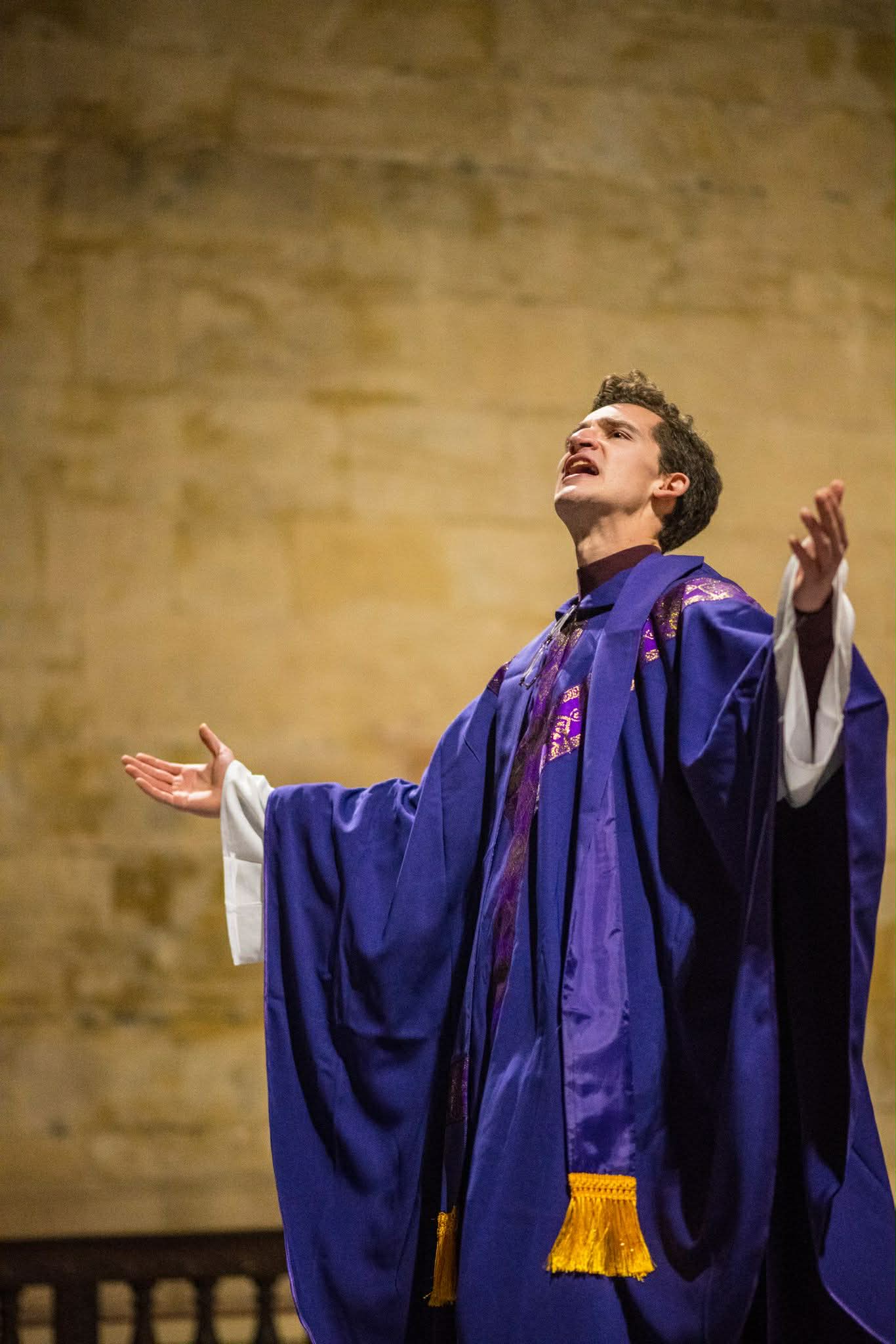 The true but literally sung hero of the play was Rich Mandel, who composed an original score and musical motifs for each character. Sung by the King’s Voices, Mandel conducted not just the choir but the audience’s mood and feelings. The combination of music and theatre was an ethereal coupling which fully capitalised on the space the chapel had to offer.