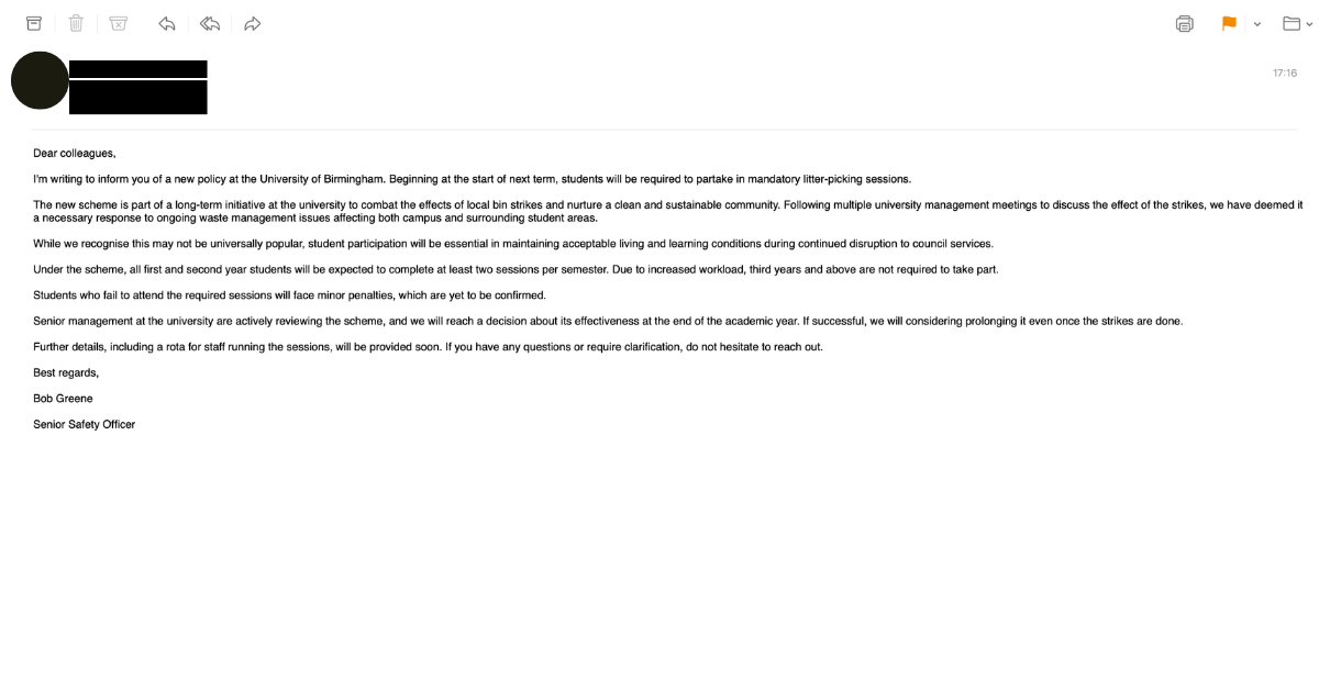 Students at Birmingham Uni will soon be required to take part in organised litter-picking sessions following ongoing disruption caused by bin strikes in the city.