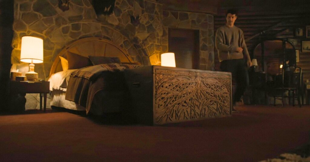 When the main couple, Nicky and Rachel, first arrive at the Cunningham house, things get spicy in the bedroom but Rachel suddenly stops her fiancé and tells him: “I have to do the thing.” She then climbs inside a wooden chest at the end of the bed, and Nicky shuts the lid on top of her. You hear her breathing inside while he walks around the room, and that’s literally the end of it.