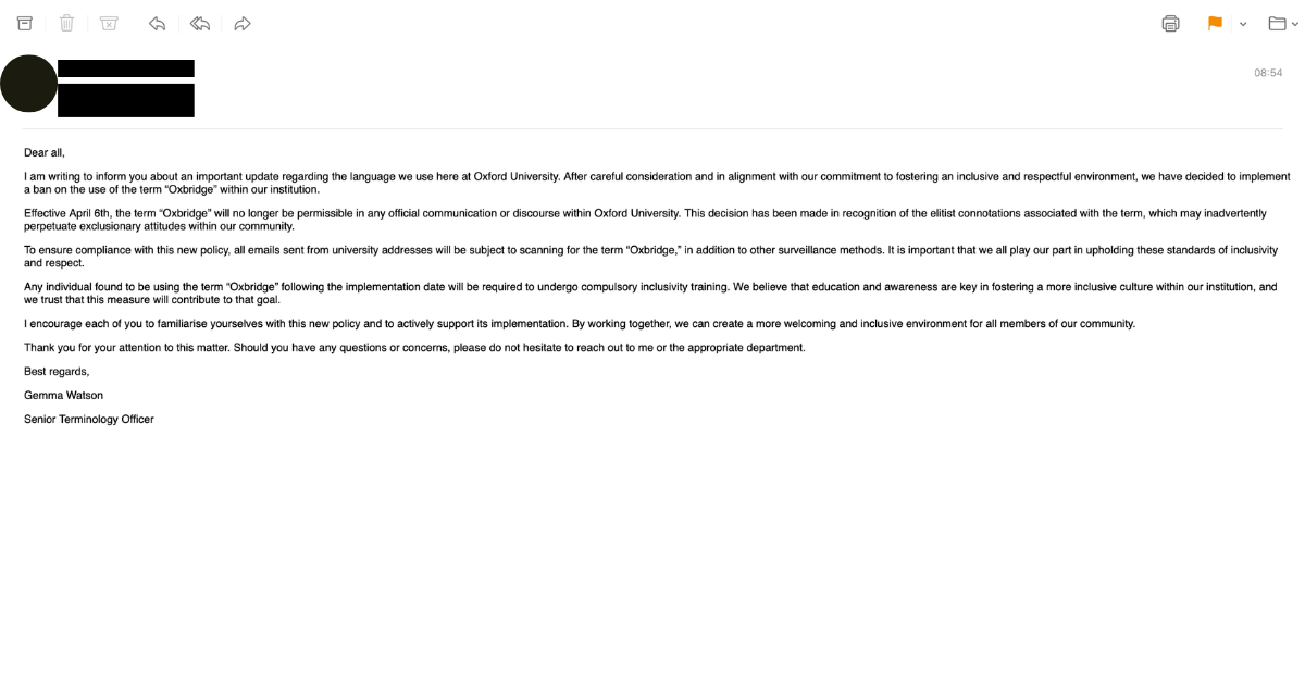 The email also revealed that that anyone found using the word “Oxbridge” after the implementation date will be required “to undergo compulsory inclusivity training.”