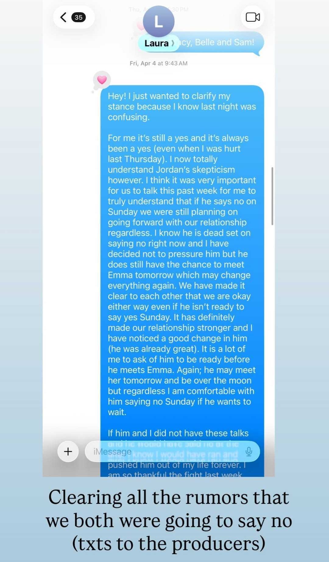 She had told Laura: “Hey! I just wanted to clarify my stance because I know last night was confusing.